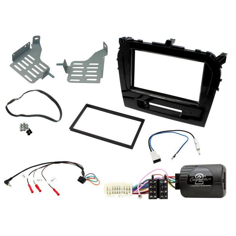 Kit de instalare Suzuki Vitara 2015-2018. Furnizat cu rama dublu DIN Piano Black, adaptor de antenă, interfață de comandă la volan și cablu universal